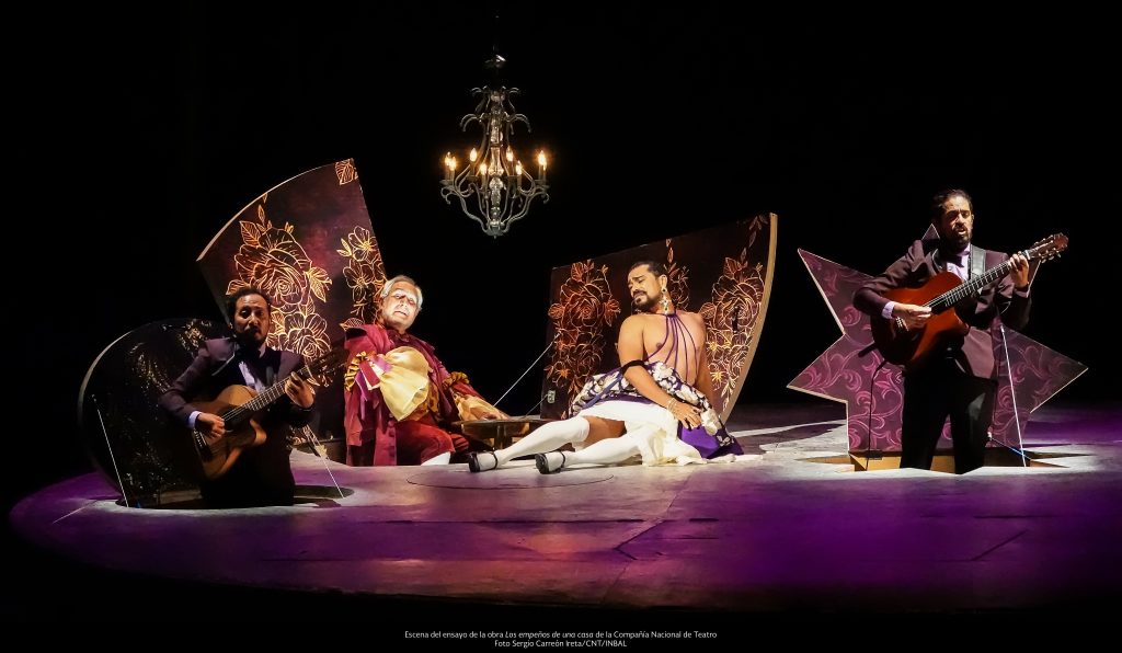 Aurora Cano: Mis montajes siempre están vinculados a la música, es una inevitabilidad en mí. Yo tomé todas las decisiones musicales, hice todo el diseño sonoro en función del repertorio que yo considero que cruza directamente. Entonces toda esa articulación sonora parte de mi interés por juntar esos dos lenguajes. Tengo la fortuna maravillosa de tener en la CNT tres músicos que son una gloria total, y además uno de ellos es un requinto espectacular. Así, tenemos guitarra, requinto y percusión. Son tres músicos increíbles que están en escena y que son una especie de evocación a los Santos y que cada cinco minutos surgen para apoyar los sonetos y para apoyar los ánimos de los personajes. Por lo cual juego mucho con este cruce de lenguajes, que al final casi no sientes la transición entre lo que se canta y lo que se dice.