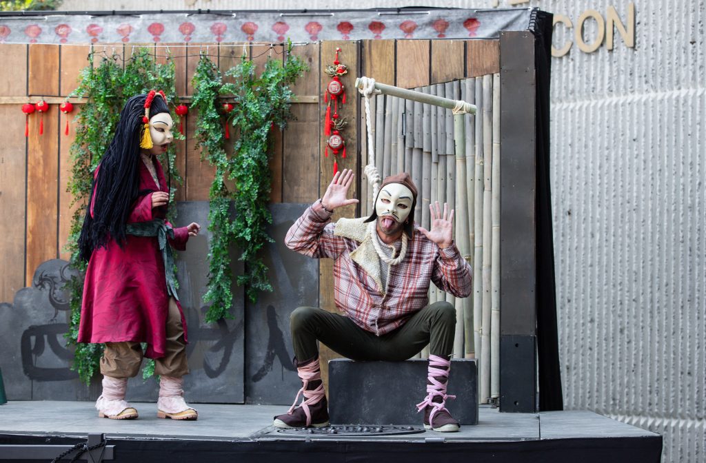 Aquí dos o tres detalles en el concepto de trabajo de los actores: primero una virtud, la energía empleada por todos, tanto vocal como corporal, que permite llegar con fluidez a los abundantes espectadores; la segunda es una observación de cuidado en cuanto a la construcción, porque aquí no están generando estereotipos, sino copiándolos. Cuando eso sucede, se duplican simplificaciones hasta generar una monotonía expresiva que puede llegar a confundir una trama que adrede se maneja como un juego.