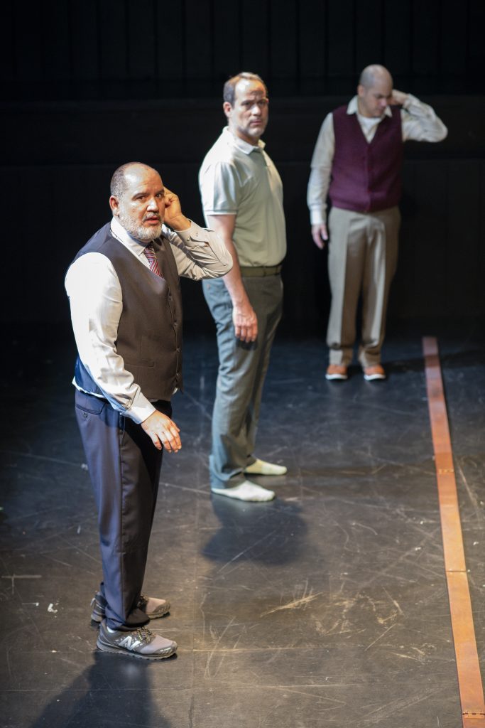 El espacio vacío no es tal y los personajes, son al mismo tiempo narradores, argumentadores, y público de lo que cuentan los otros – nosotros. Para esto las ropas son sólo señales obvias que pueden ponerse y sacarse como cualquier actor en escena: absolutamente obvio y por ende casi invisible. Ellos son Misha Arias, Gilberto Dávalos y Antón Araiza. Excelentes los tres bajo una dirección de detalle que permites tejer los casi constantes cambios para pasar de la anécdota al juicio (¿) o al comentario. El rol del observador externo es a elección y depende de cada uno con un casi inexistente chantaje emocional.