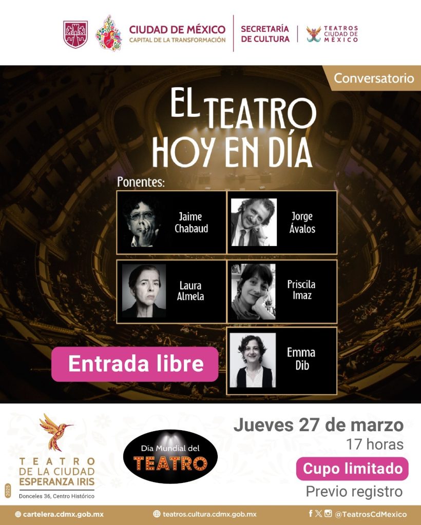 El jueves 27 de marzo tendrá lugar el conversatorio El teatro hoy en día, una mesa de reflexión sobre el teatro en la actualidad, en el que participarán Laura Almela, José Sefami, Emma Dib, José Ávalos, Priscila Imaz y Jaime Chabaud, a las 17 horas, en el Foyer del Teatro de la Ciudad Esperanza Iris, con cupo limitado a 80 personas.