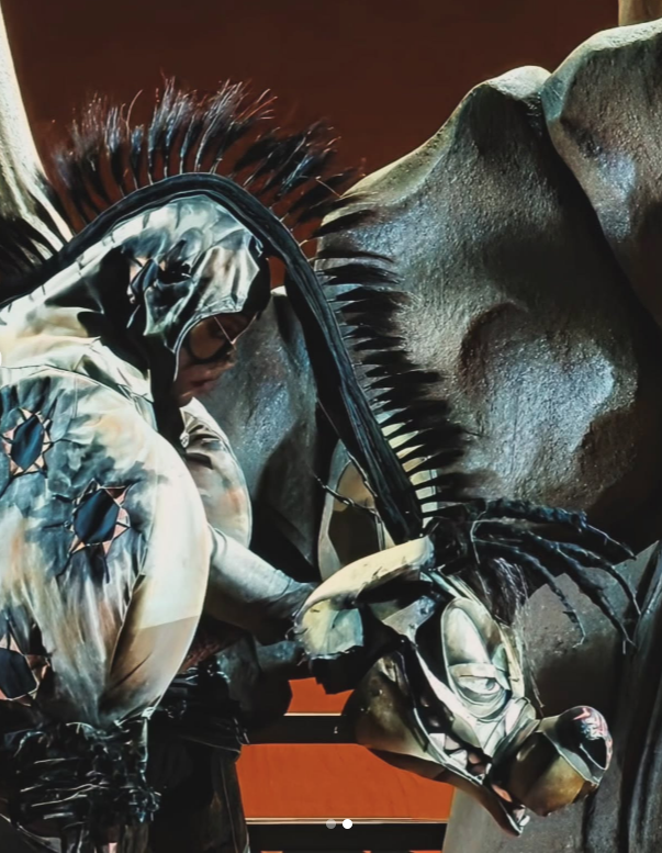 Diego y Manu: Porque trabajar en una obra de estas dimensiones nos convierte en deportistas de alto rendimiento. Es un trabajo muy demandante y necesitamos resistencia. Nuestros trajes son pesados y la postura de hiena, con la cabeza entre el tronco y las piernas, hacia el frente —desplante permanente, cuellos y brazos hacia abajo, isométricos casi todo el tiempo— nos exige entrenar y levantar pesas constantemente.