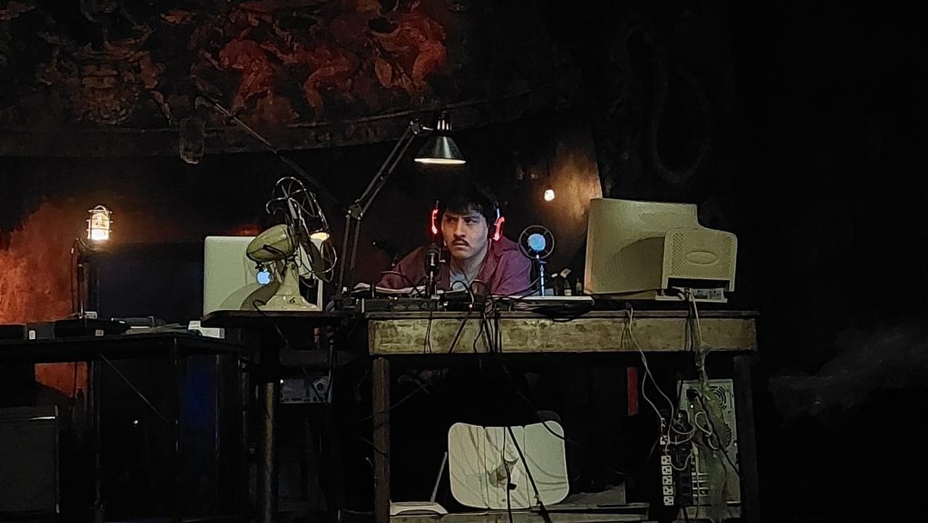 La mano peluda: episodio maldito es el nuevo intento del teatro mexicano, chilango, por sumergir al público en una experiencia terrorífica. El público ingresa por detrás del escenario del Teatro Ofelia, por una oscura escalera que tiene en los descansillos figuras satánicas, ídolos paganos y muñecos simplemente «creepys». Al llegar a la butaquería el público se encuentra con unos audífonos que serán la tortura auditiva que taladrarán los oídos de los espectadores gran parte de la obra. La fábula se desarrolla con gran lentitud y tiene una evidente estructura tríptica. La primera parte el actor Mario González Solís (quien hace de JR) interactúa de manera frontal con el público para darle todo el contexto que es necesario para comprender en la obra. La historia es atractiva, pero es ajena para el público que generalmente no es consumidor de historias paranormales. Si bien el solo nombre de La mano peluda para muchos es un referente muy claro, para toda una generación que no se forjó escuchando la radio o para quienes vivimos fuera de la Ciudad de México, el nombre no dice absolutamente nada. La segunda parte de la obra, que dura aproximadamente 60 minutos, es toda la investigación sonora de JR. Las acciones del personaje son bastante débiles y se limita a ir de audio en audio tomando notas. Y por último… ¡No! No voy a revelar el final, porque las imágenes que contiene son verdaderamente efectivas en su golpe de terror. Este es un género que podría arruinarse con facilidad si se develaran detalles del desenlace.