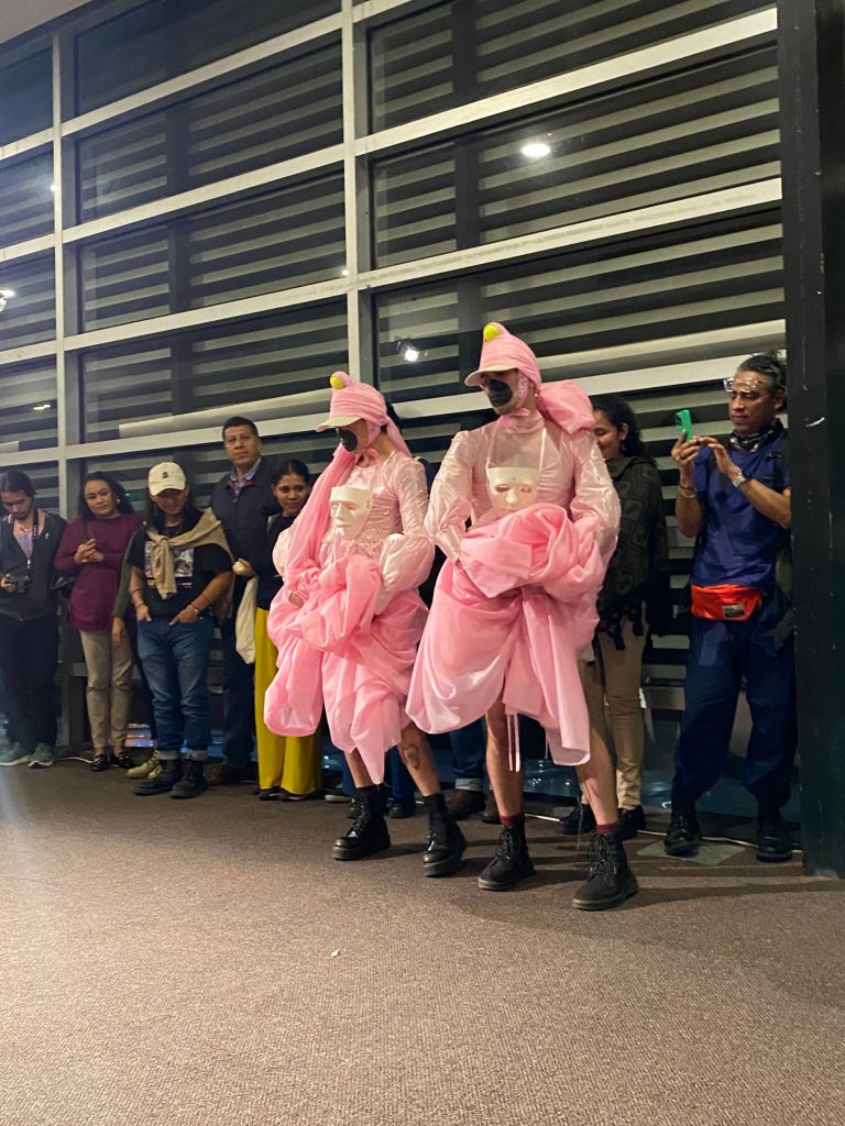 Cuando la quietud se evapora, con pisadas lentas y pesadas, lxs bailarinxs marcan un trayecto lineal que se abre paso entre el público. Al unísono, desenvuelven dos largos trozos de tela rosa con una meticulosidad casi sacra. De a poco, los dejan caer al piso para quedar como estelas o líneas que bien pueden ser metáfora de la construcción de un camino otro, de una vía alterna y disidente para transitar la vida, el sexo, el género.